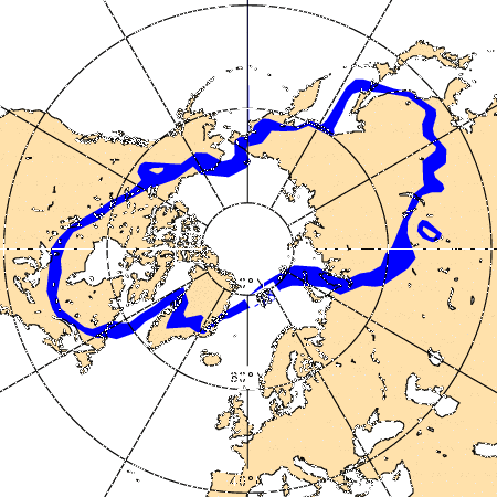Using this threshold, the image below shows the mean position of the arctic air mass in January.