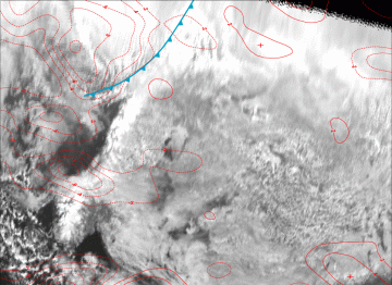 23 March 2009/12.00 UTC - Meteosat VIS 0.6 image; red: height contours 700 hPa