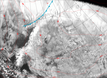 23 March 2009/12.00 UTC - Meteosat VIS 0.6 image; magenta: θe 850 hPa. The location of the Arctic Front is shown.