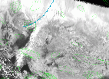 23 March 2009/12.00 UTC - Meteosat VIS 0.6 image; green: PVA 700 hPa