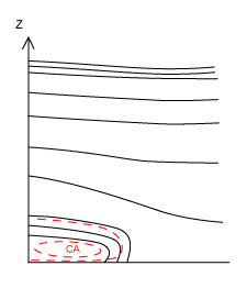 23 March 2009/12 UTC - Vertical cross section; black: isentropes (θe), red thick: temperature advection - WA, red thin: temperature advection - CA