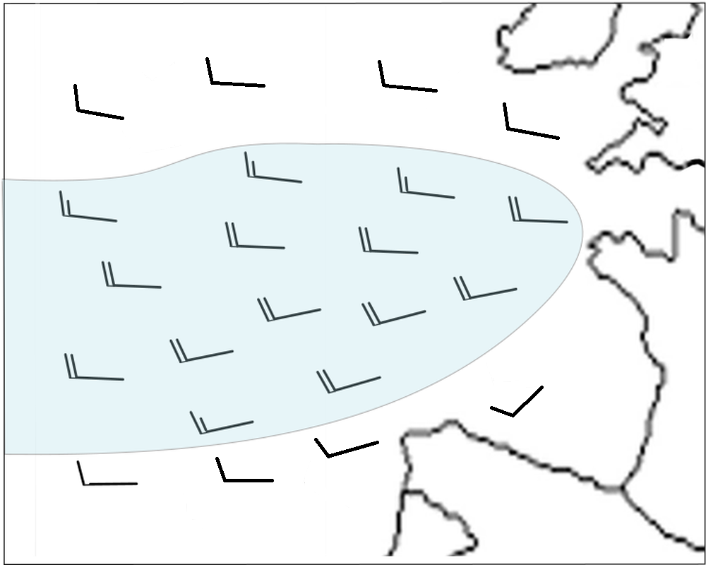 Figure 18: Schematic of the Atmospheric Thickness parameter (500-1000hPa) in respect to the position of the AR.