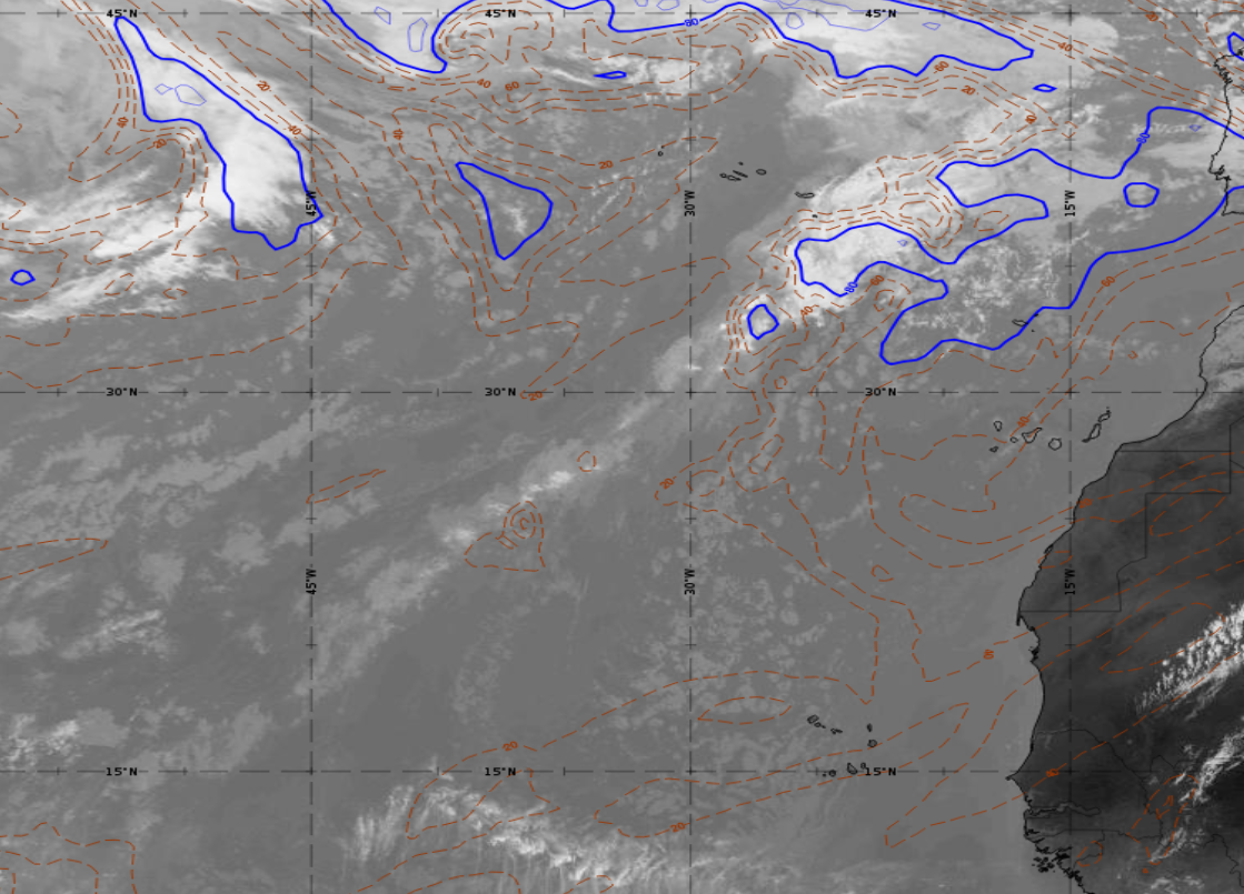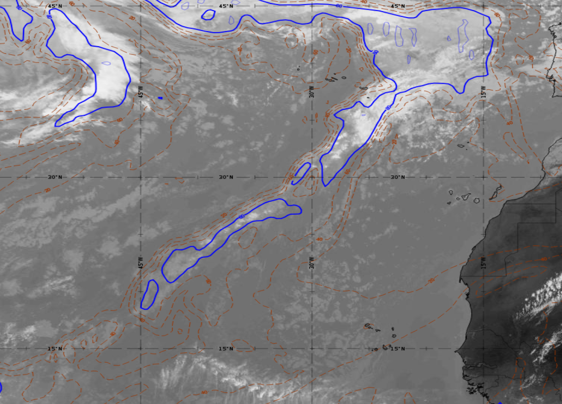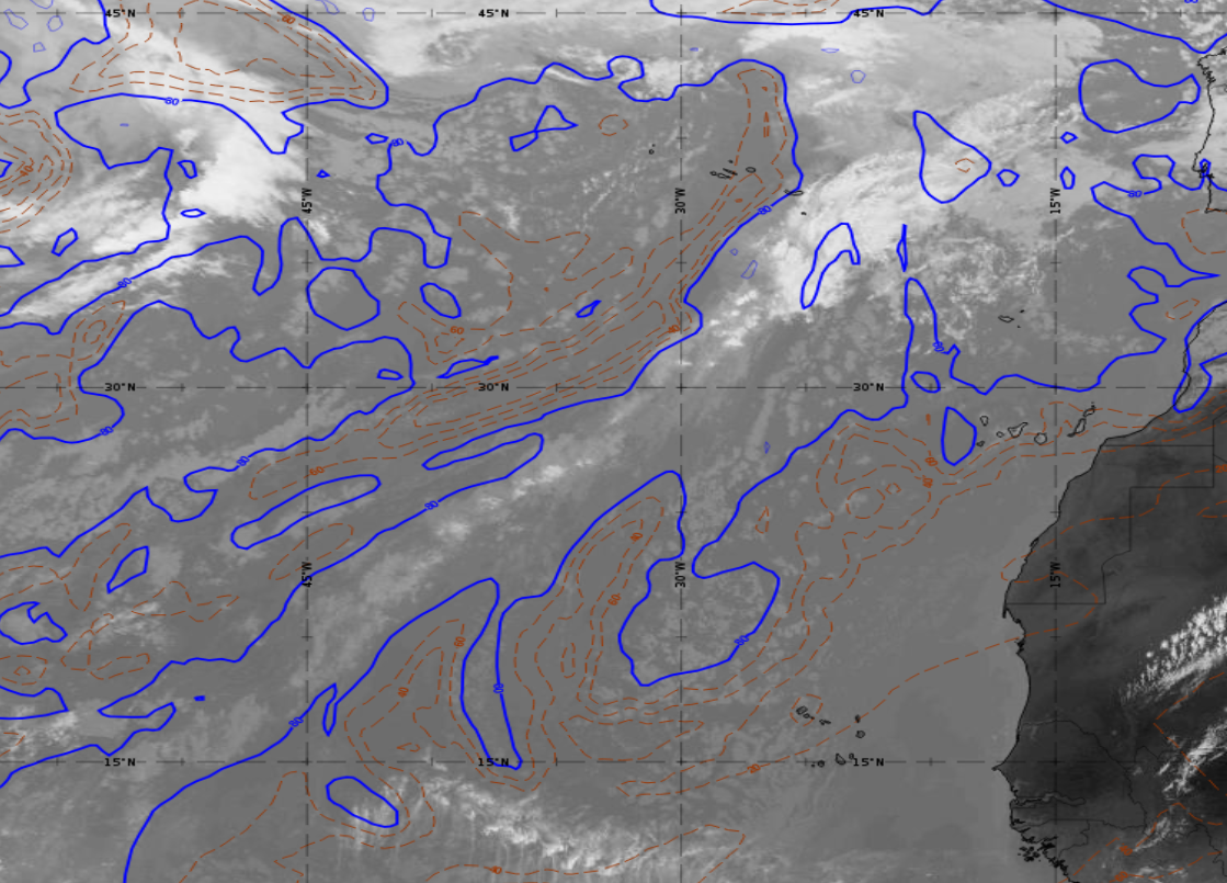 (middle) and 850 hPa (bottom) superimposed on SEVIRI