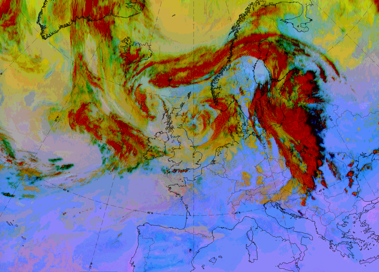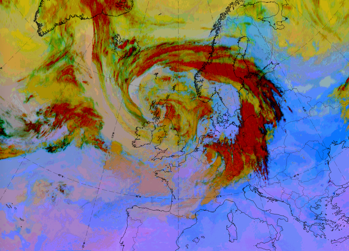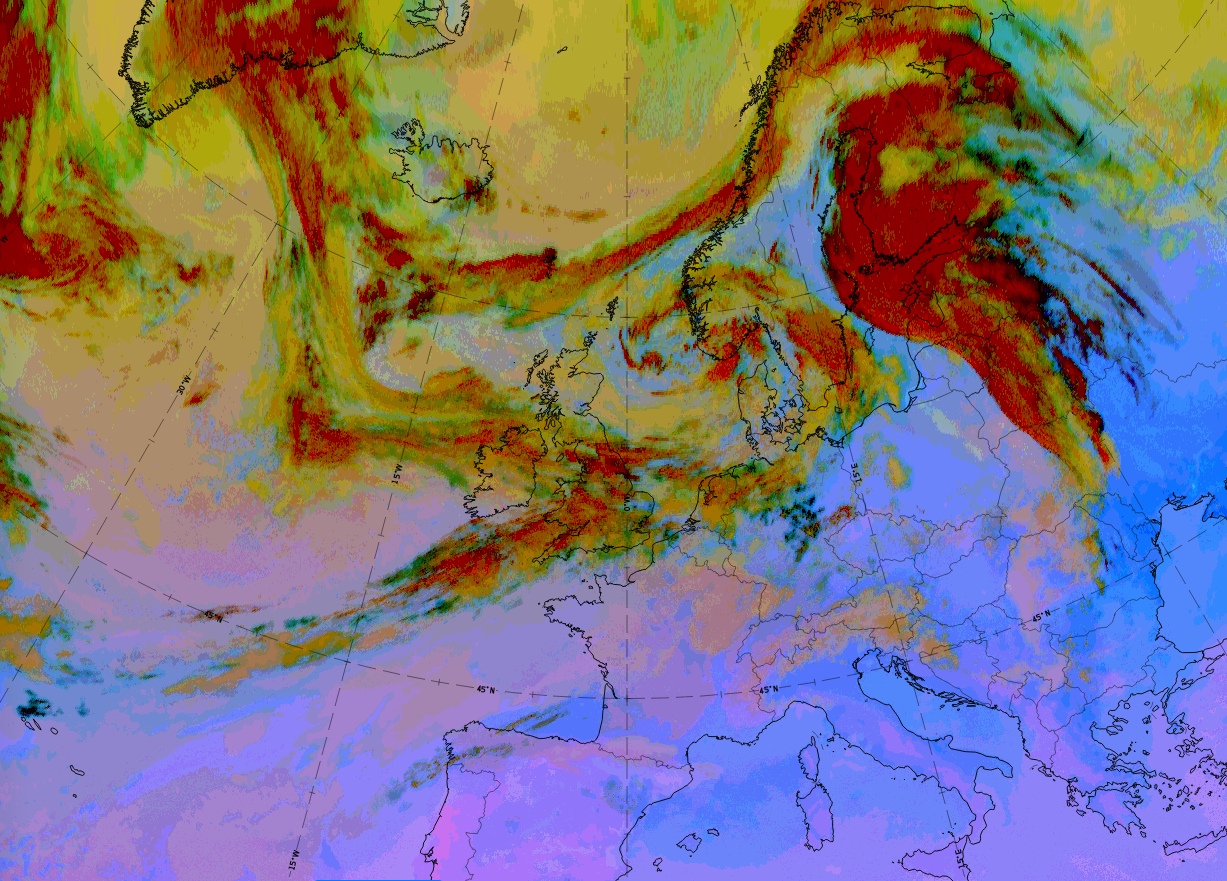 | Airmass RGB | Dark brown colours in front of and behind the back-bent cloud band. On the south-eastern side this is the cold air in the original occlusion centre and on the north-western side this is the approaching cold air responsible for the change from occlusion to Back Bent Occlusion. |