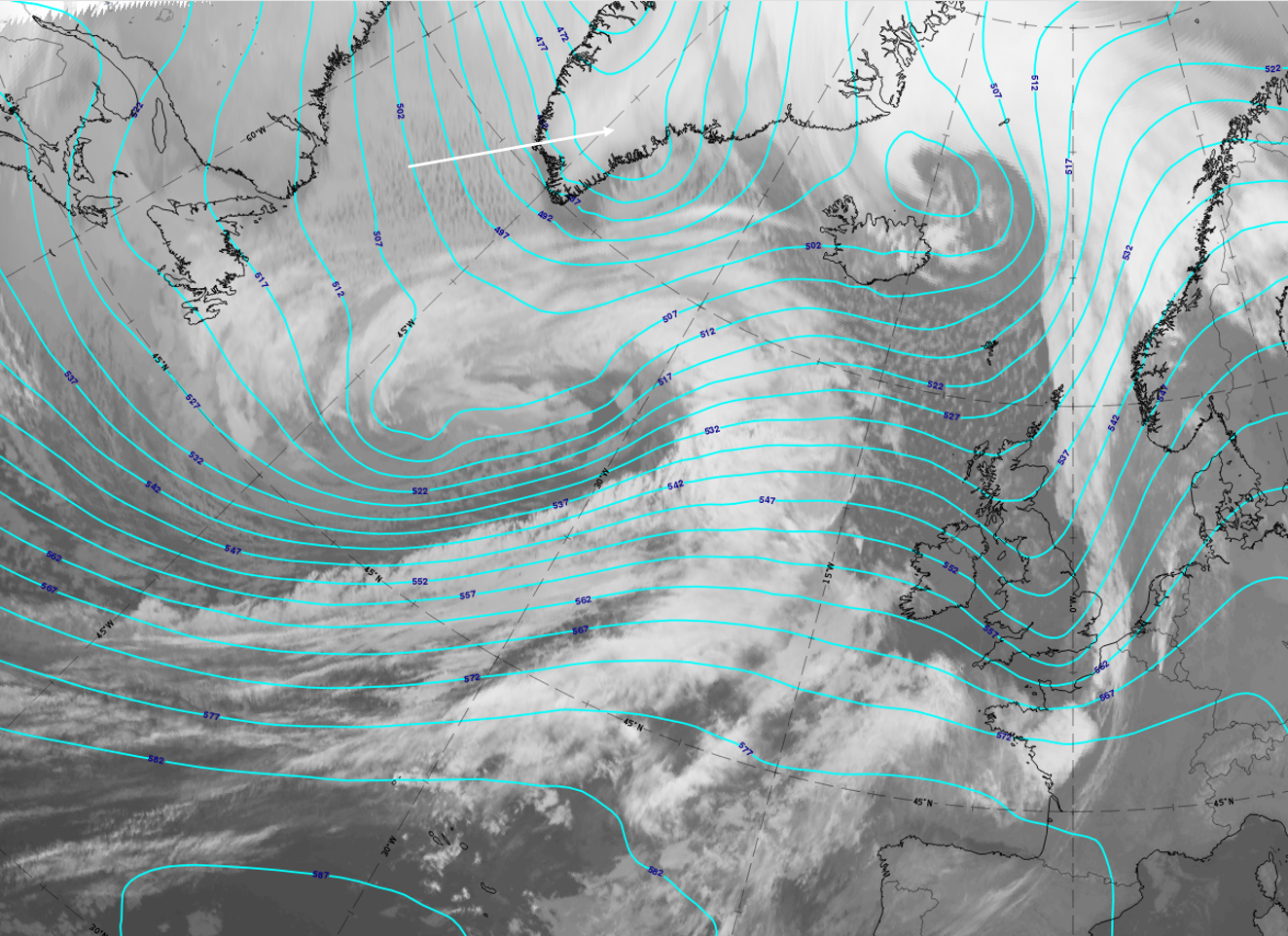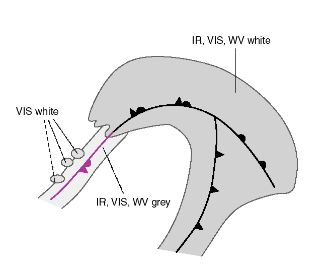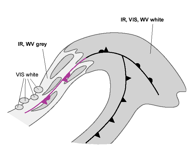 In most cases the IR and WV images of the cloud band related to the Back Bent Occlusion have grey colours, indicating rather lower cloud tops.