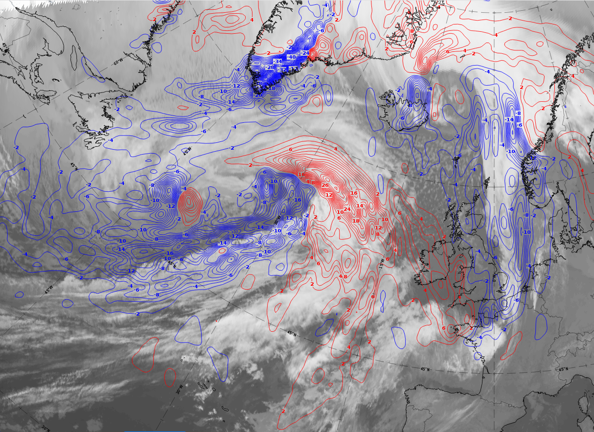 IR images from 6 January 2020 at 18 UTC; l: cyan: height contours 500 hPa; right: temperature advection at 700 hPa; red: warm advection, blue: cold advection.