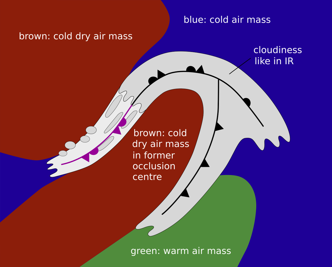 During the transition of the cloud band from an occlusion to a Back Bent Occlusion brown and dark-brown areas, representing cold and dry air, appear and intensify on both sides of the Back Bent Occlusion cloud band. This corresponds to the process of advection of cold air on the north, north-east side.
