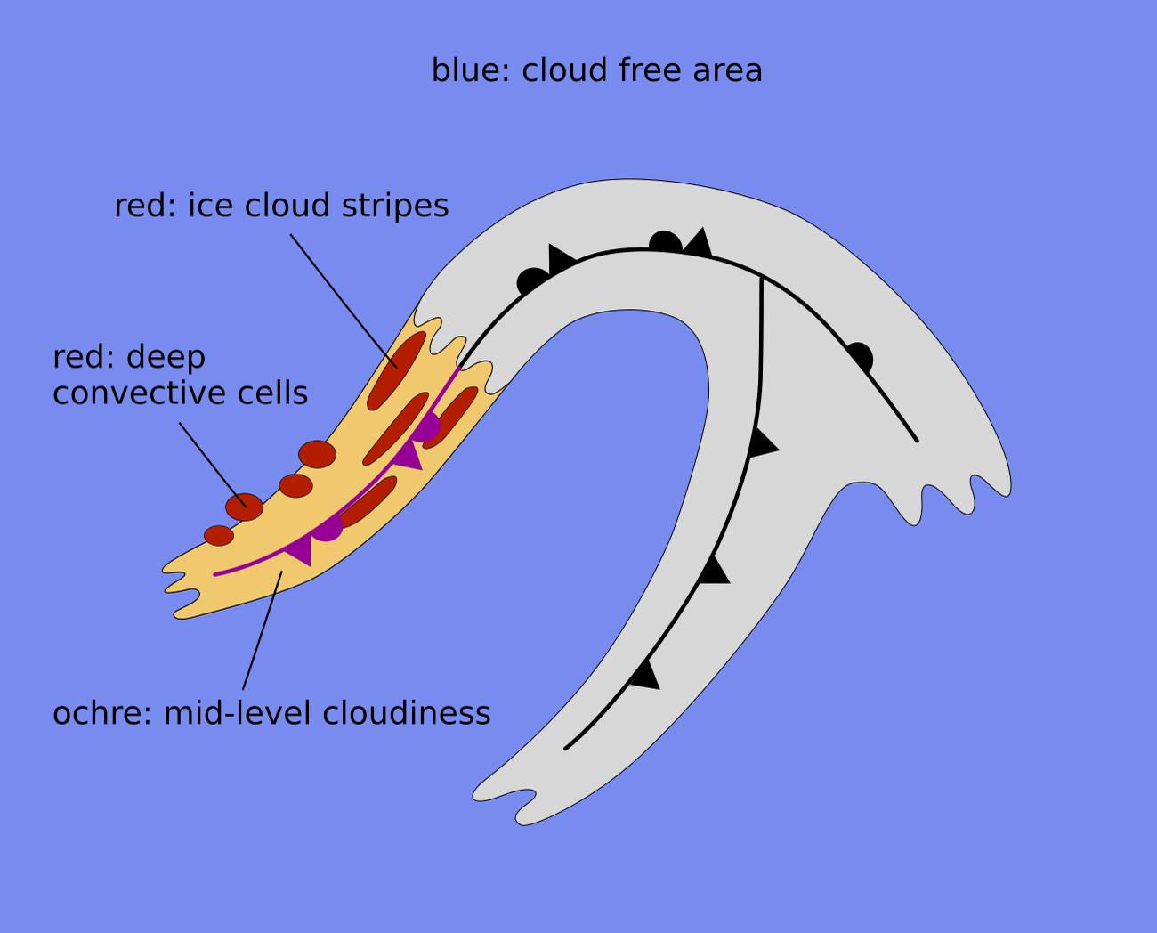 The cloud band consists of ochre and dark-red areas, representing mid-level and thick cloud regions.
