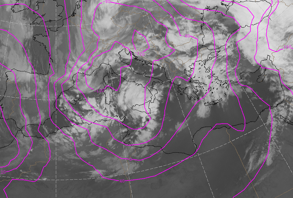 06 March 2009/12.00 UTC - Meteosat 9 IR10.8 image; magenta: height contours 1000 hPa