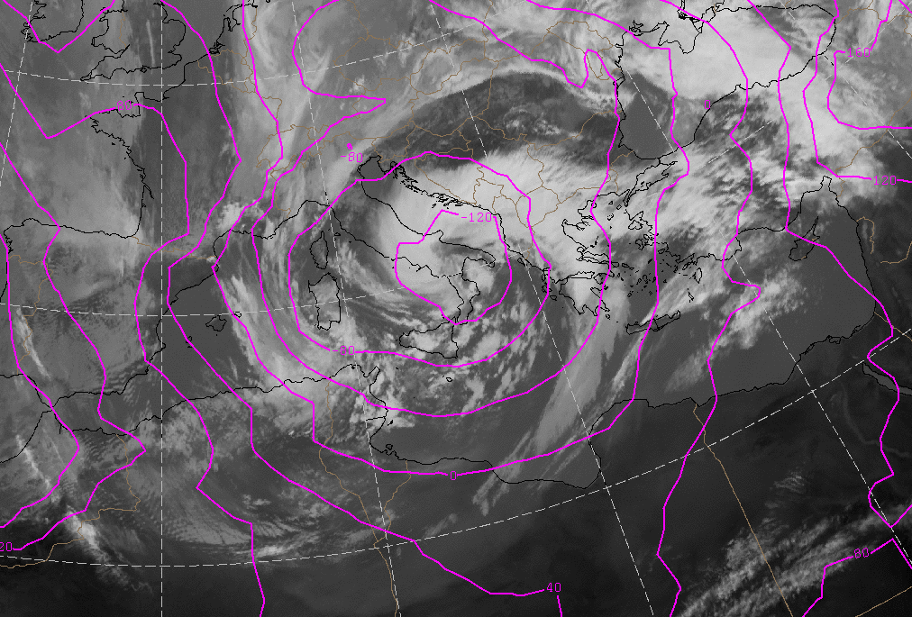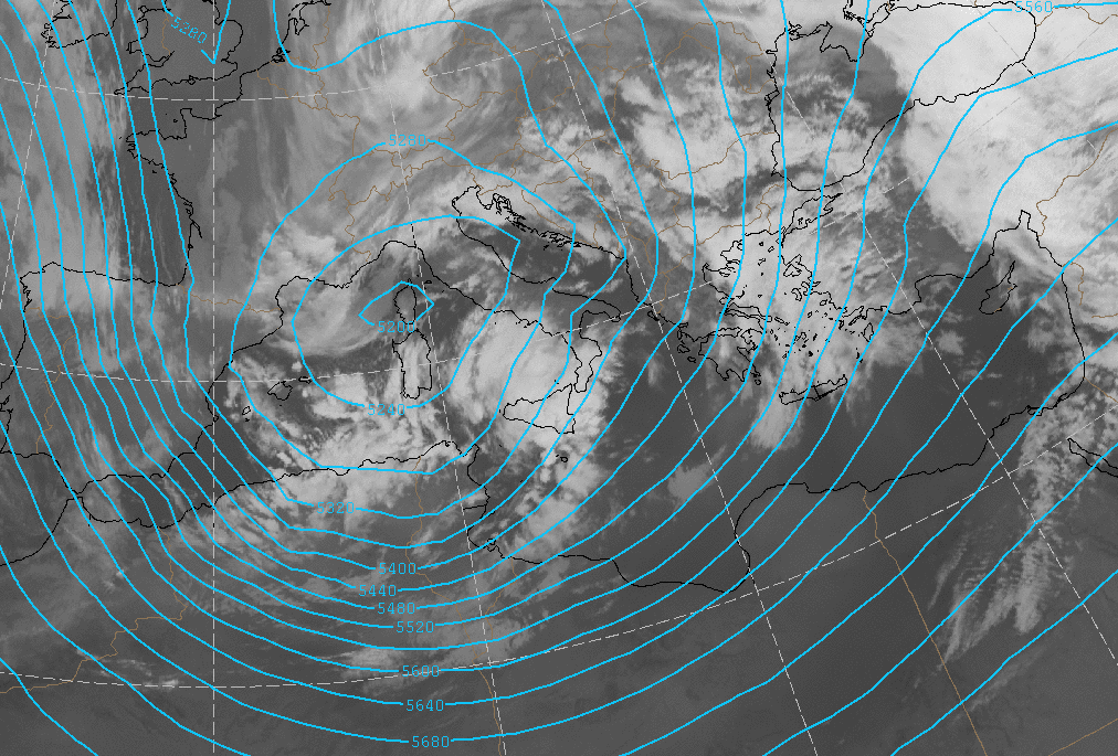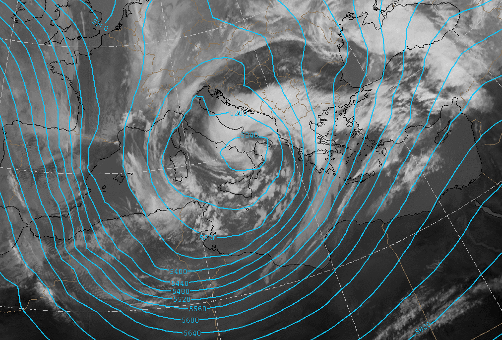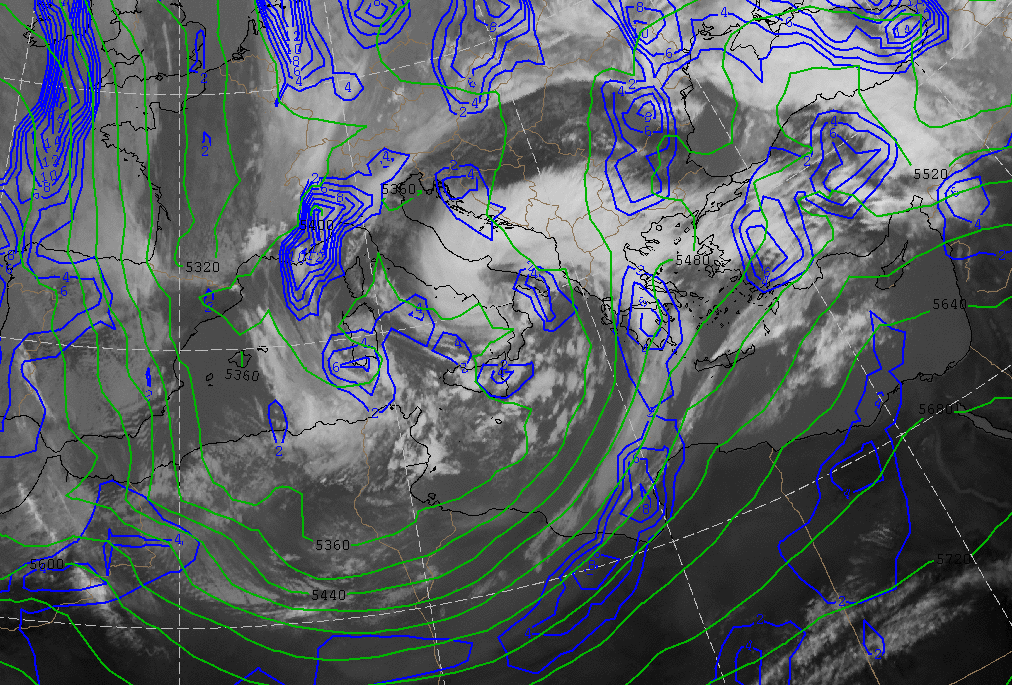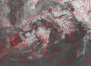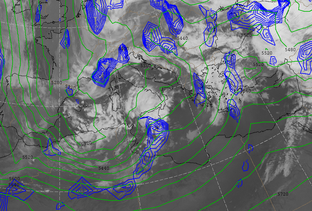 06 March 2009/00.00 UTC - Meteosat 9 IR10.8 image; green: height contours 500 hPa