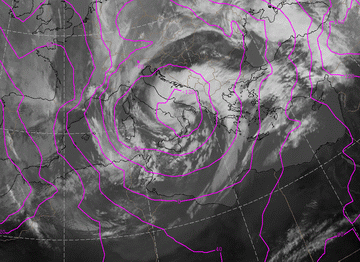 06 March 2009/00.00 UTC - Meteosat 9 IR10.8 image; magenta: height contours 1000 hPa