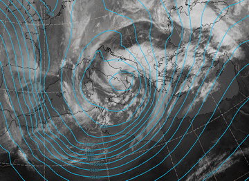 The equivalent thickness is characterized by a trough behind the cloud spiral indicating cold air.