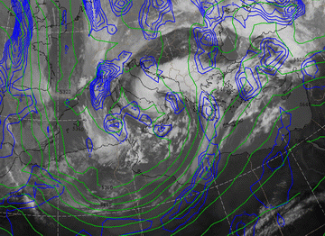 06 March 2009/12.00 UTC - Meteosat 9 IR10.8 image; blue: thermal front parameter 850 hPa, green: thickness 500/1000 hPa