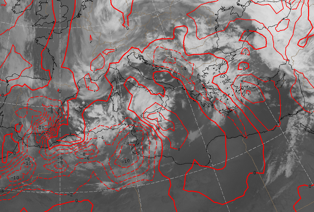 06 March 2009/12.00 UTC - Meteoasat 9 IR10.8 image; red dashed line: Cold Advection red line: Warrm Advection 500/1000 hPa