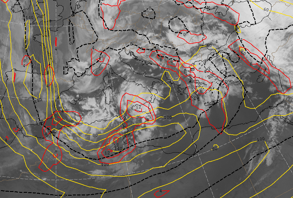 06 March 2009/12.00 UTC - Meteosat 9 IR 10.8 image; Yellow: isotachs 300 hPa; red: PVA 300 hPa; Black: Jet axis