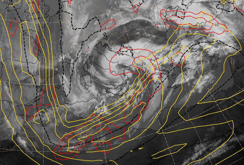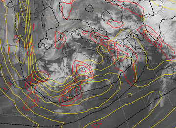 06 March 2009/00.00 UTC - Meteosat 9 IR10.8 image; yellow: isotachs 300 hPa; red : PVA 300 hPa; Black: Jet axis