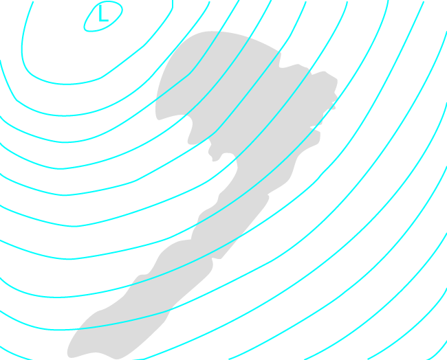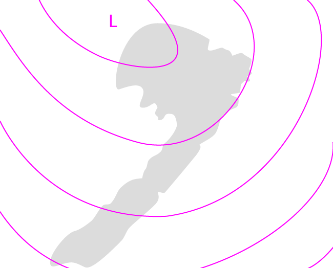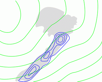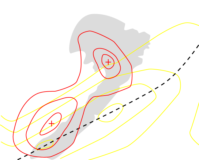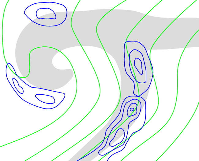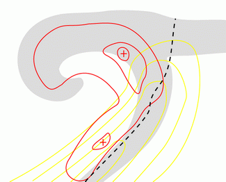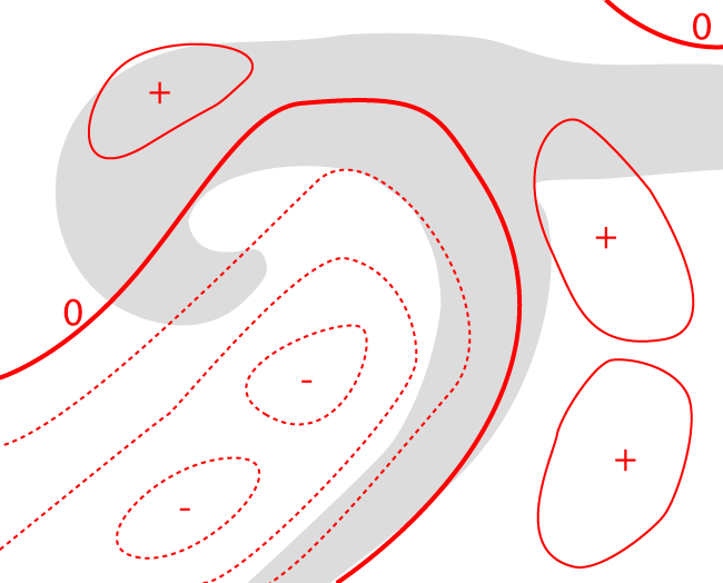 The surface trough is rather weak in the initial stage and can be found at the leading edge of the Baroclinic Boundary. During development the trough intensifies, depending on the strength of the development. - Thermal front parameter: