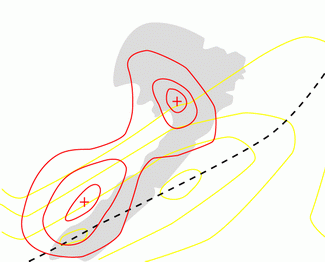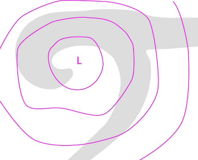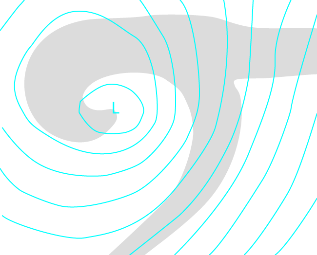 The absolute topography shows in the inital stage two upper level troughs: a synoptic scale trough which can be found at the rear of the cloud band of a Cold Front, and a secondary weaker trough where Comma - like cloudiness develops. During the stages of development this trough becomes more and more pronounced. In the maturing stage of the Cold Air Development often a low can be found in the centre of the cloud spiral.