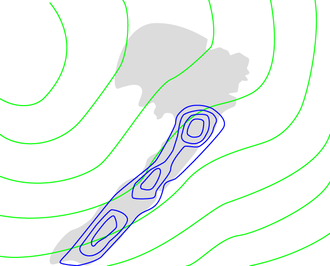 The existence of a thermal front parameter, mentioned before, marks the biggest change of the thickness gradient, but isolines of thickness never show such pronounced gradients as observed with classical fronts. This is another indication that there is no big difference between the air masses in front of and behind the Cold Air Development (compare Meteorological physical background ). - Temperature advection: