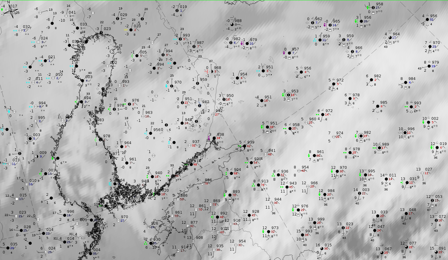 27 October 2019, 12UTC: IR + synoptic measurements (above) + probability of moderate rain (Precipitting clouds PC - NWCSAF)