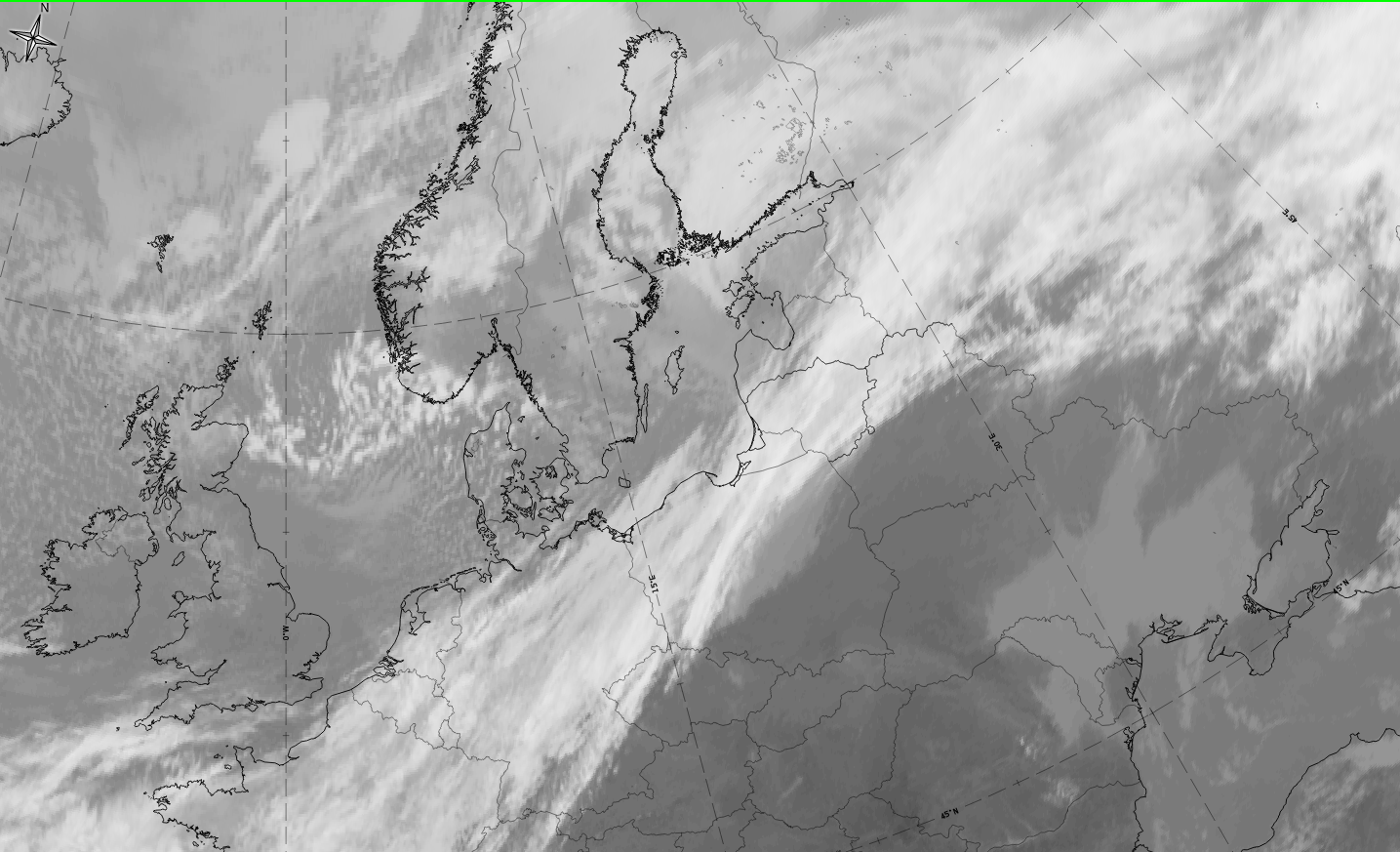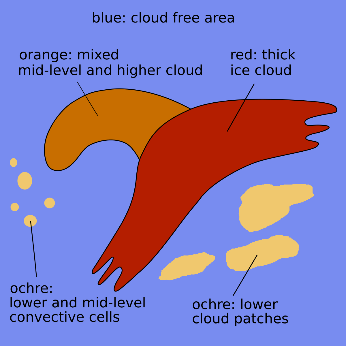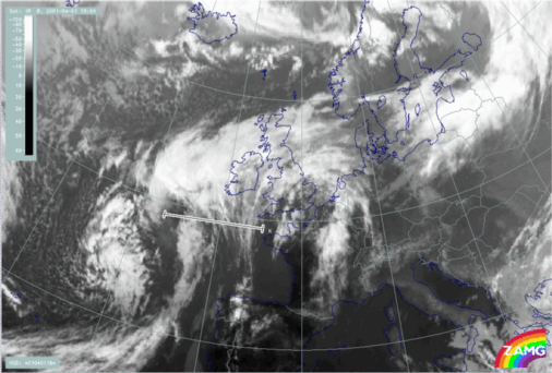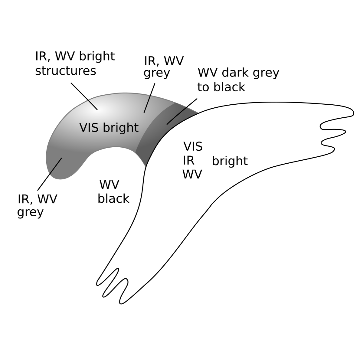 - At the boundary between the cloud band of the cold and warm front (oriented south-west to north-east) and the clouds associated with the cold conveyor belt type, a distinct gradient from white to (dark) grey can be observed. Often at some distance away from the boundary, cloud tops gradually become higher (whiter) followed again by a decrease of cloud-top heights within the innermost part of the cloud spiral. Such a cloud structure can be well explained with the conveyor belt theory (see Meteorological physical background ).