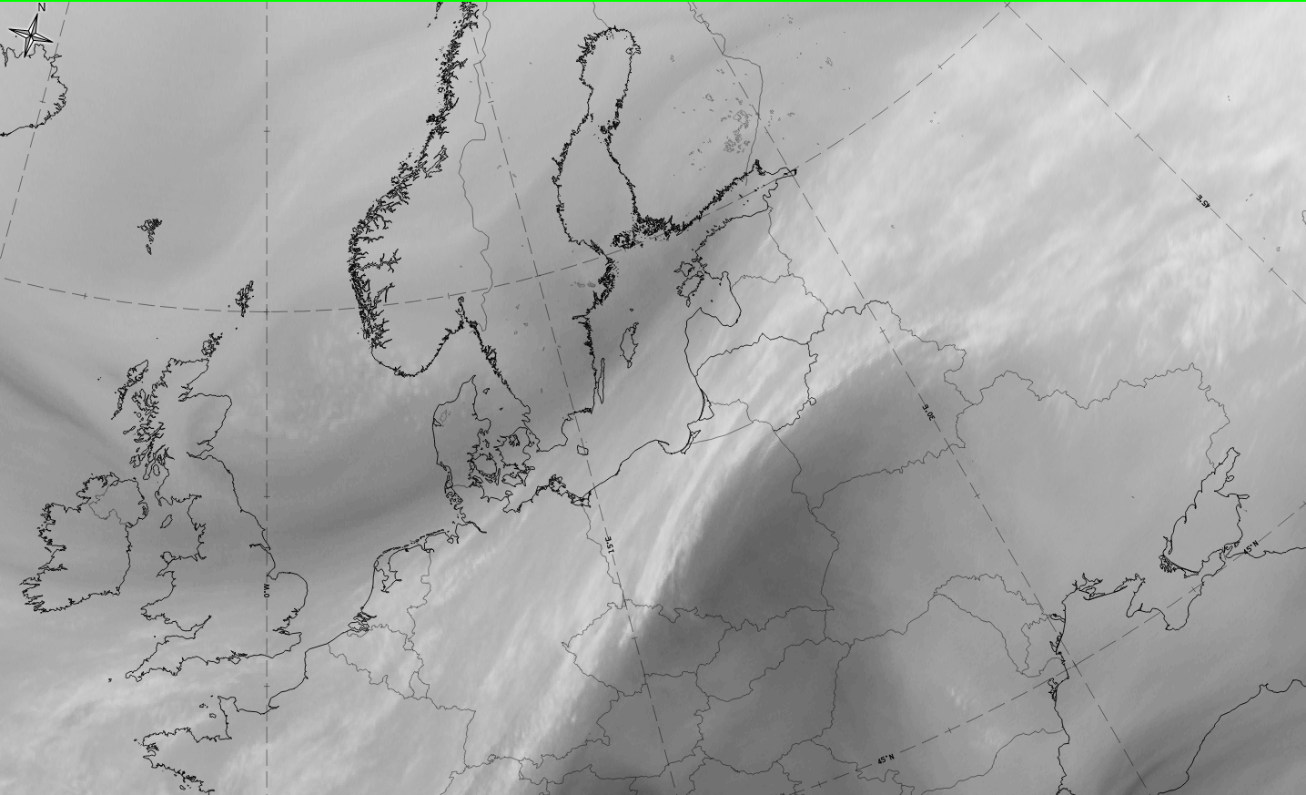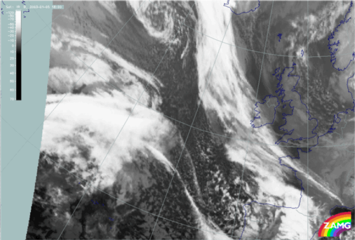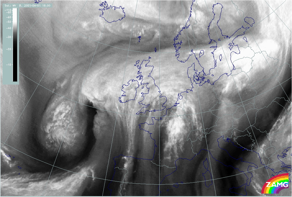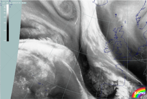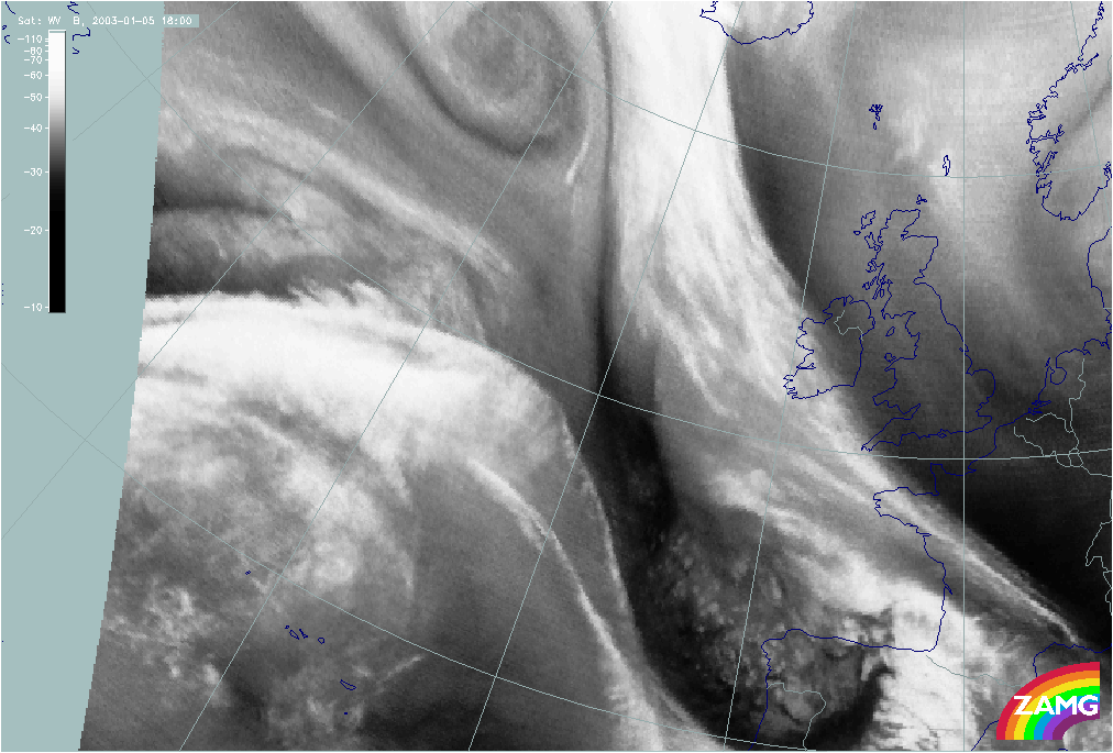 - In the WV image the two cloud bands with different cloud types are seen with even greater contrast. A black stripe characterising the dry air on the cyclonic side of the jet axis extends parallel to the higher cloud band and immediately crosses the cold conveyor belt cloudiness at the boundary. This effect cannot be detected in the case of an occlusion of the warm conveyor belt type. The driest air represented by darkest pixel values is included in the spiral development. This fact can be observed in both types of occlusion (see Occlusion: Warm Conveyor Belt Type ). During the later stages of development, high and therefore bright pixel values can be observed within the entire cloud spiral which means that the crossing black stripe is no longer visible.