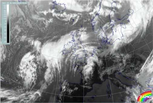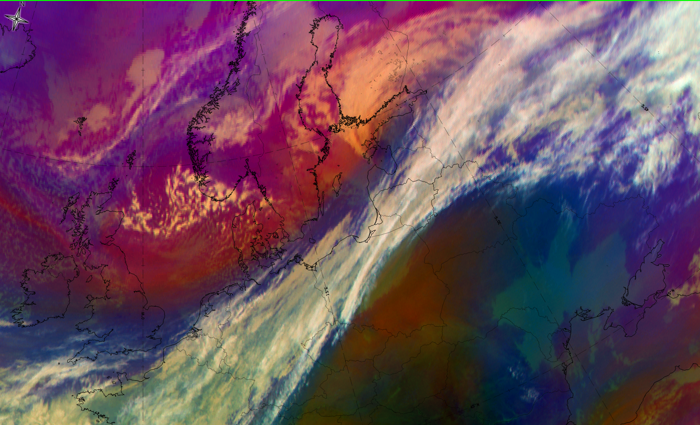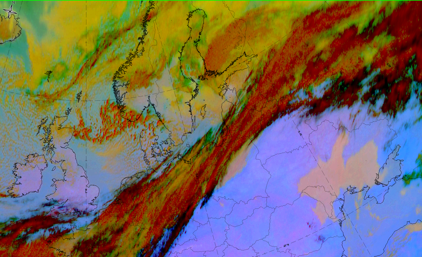 The airmass RGB represents the warm and cold air masses in front of the frontal system with blue and green colours - depending on the geographical latitude. Green colours are more frequent in the southern areas. Behind the frontal cloud and the spiral cloud bands there are mostly brown colours, representing the sinking dry airmass. However, sometimes the colour here is blue, demonstrating that cold air exists.
