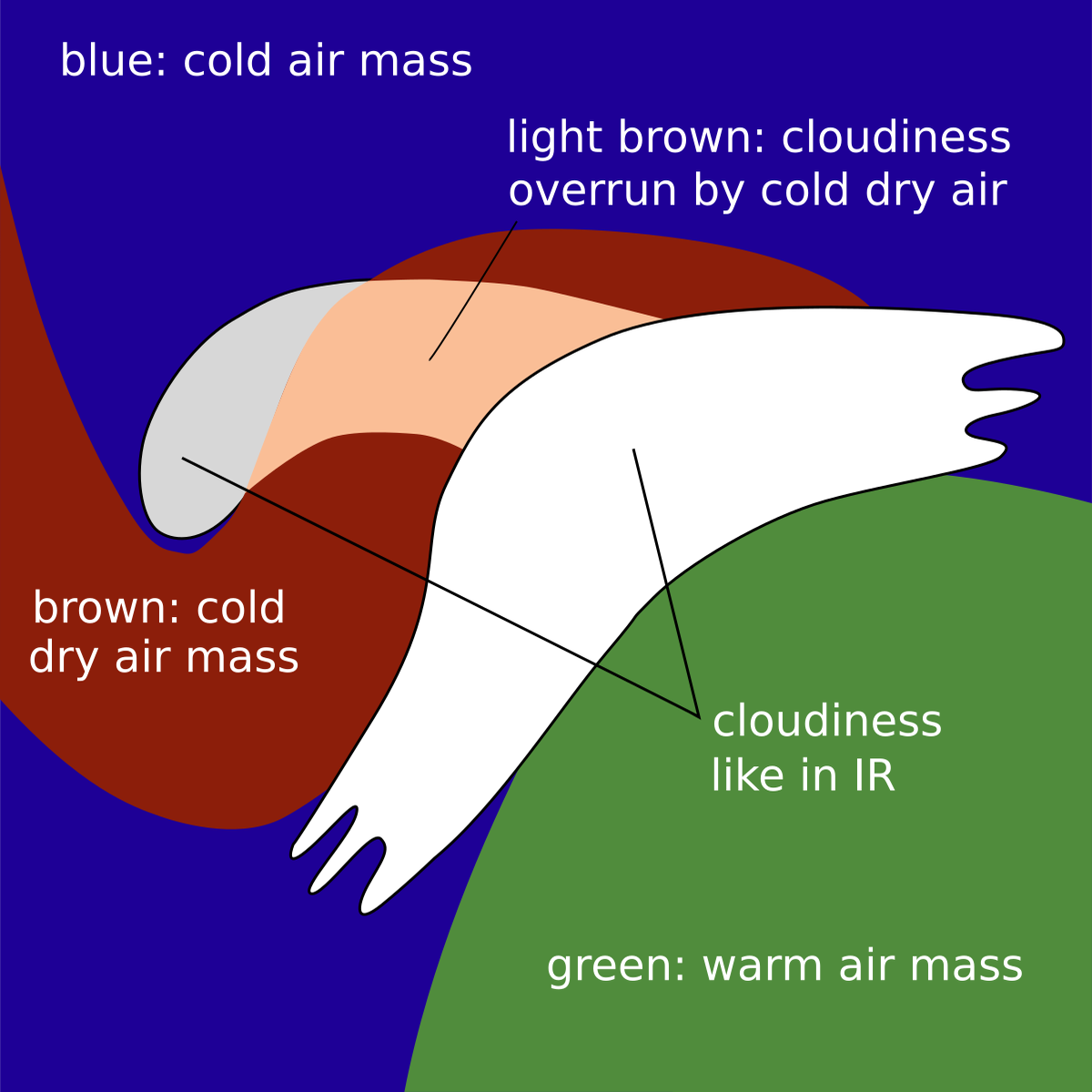 As already mentioned in the general remarks, the cloud band of the occlusion described in this chapter develops in the area of a wave (see Wave ) However, the cloud band exhibits clearly different cloud layers, in contrast to the occlusion of the warm conveyor belt type (see Occlusion: Warm Conveyor Belt Type ).