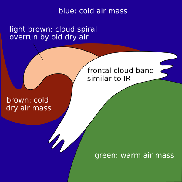 In IR images a lower cloud spiral gradually appears from below the higher cloud band. There is a dark area between Cold and Warm frontal cloudiness and the cloud head.
