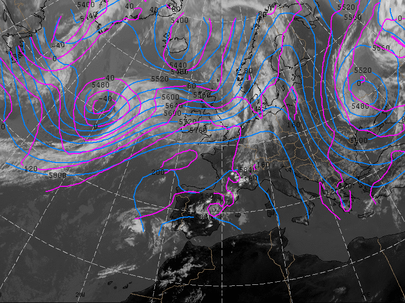 21 June 2005/12.00 UTC - Meteosat 8 IR 10.8 image; magenta: height contours 1000 hPa, cyan: height contours 500 hPa
