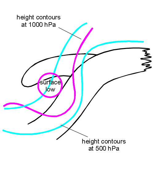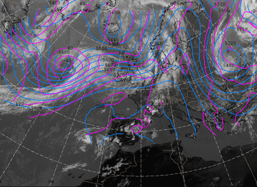 The absolute topography at 1000 hPa is characterized by a low in the height field in the centre of the cloud spiral. At 500 hPa in the initial stages an upper level trough exists, which develops into an upper level low during a later stage of development. This is a main difference from the Warm Conveyor Belt Occlusion type where a closed cyclonic circulation already exists very early on (see Occlusion: Warm Conveyor Belt Type ). Consequently the Cold Conveyor Belt Type often changes to a Warm Conveyor Belt Type later on. - Equivalent thickness: