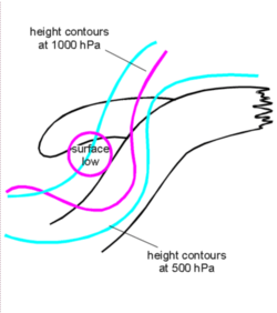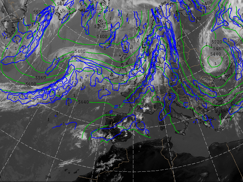 The jet axis crosses the frontal cloud band in the area of the point of the Occlusion as described above. If a well developed jet streak exists, the cold conveyor belt cloud spiral is situated within the area of the left exit region of this jet streak; consequently in the satellite image cellular structured colder cloud tops can be observed (see Cloud structure in satellite image). - Vorticity advection at 500 hPa and 300 hPa: