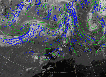 21 June 2005/12.00 UTC - Meteosat 8 IR 10.8 image; blue: thermal front parameter 500/850 hPa, green: equivalent thickness 500/1000 hPa