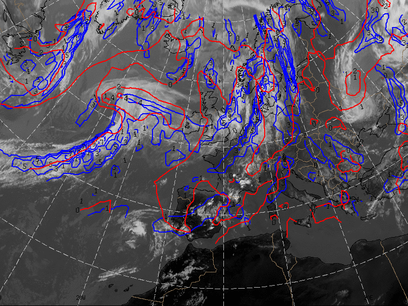 21 June 2005/12.00 UTC - Meteosat 8 IR 10.8 image; blue: thermal front parameter 500/850 hPa, red: warm advection 500/1000 hPa