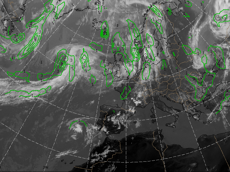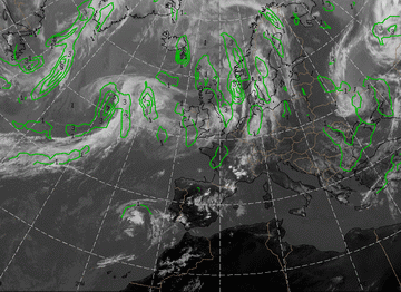 21 June 2005/12.00 UTC - Meteosat 8 IR 10.8 image; green: positive vorticity advection (PVA) 500 hPa