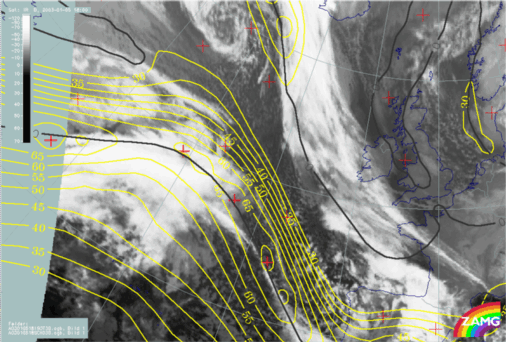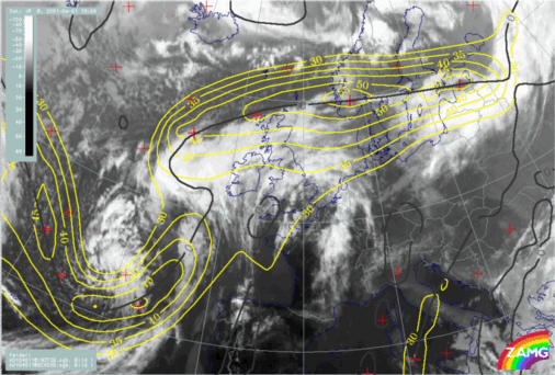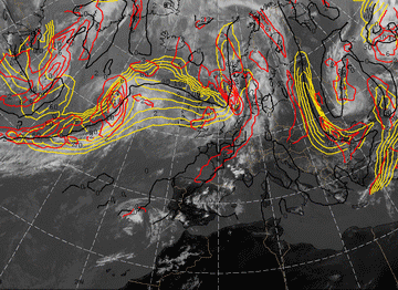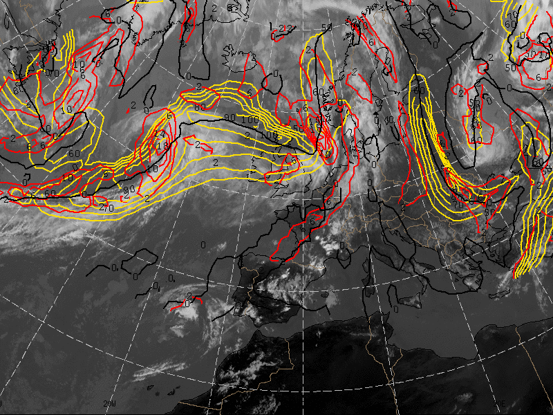 05 January 2003/18.00 UTC - Meteosat IR image; yellow: isotachs 300 hPa, black: zero line of shear vorticity 300 hPa