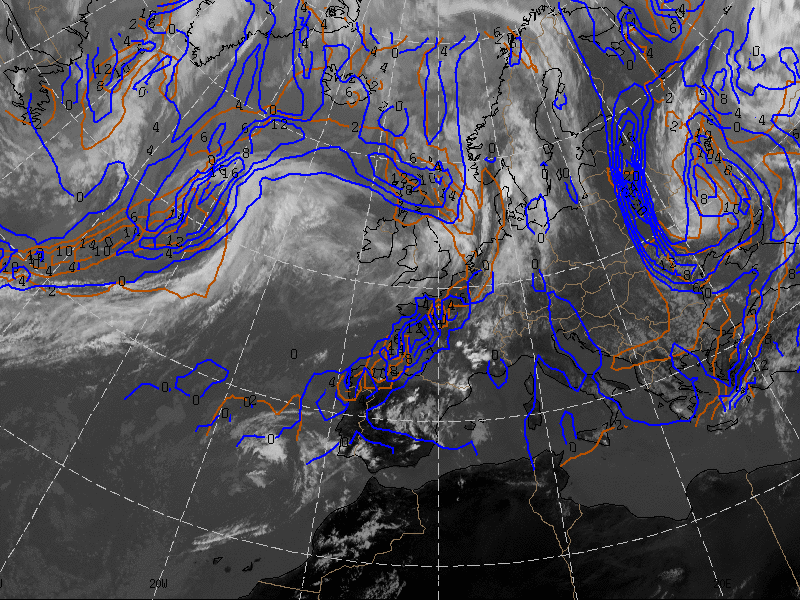 21 June 2005/12.00 UTC - Meteosat 8 IR 10.8 image; blue: shear vorticity 300 hPa, brown: curvature vorticity 300 hPa