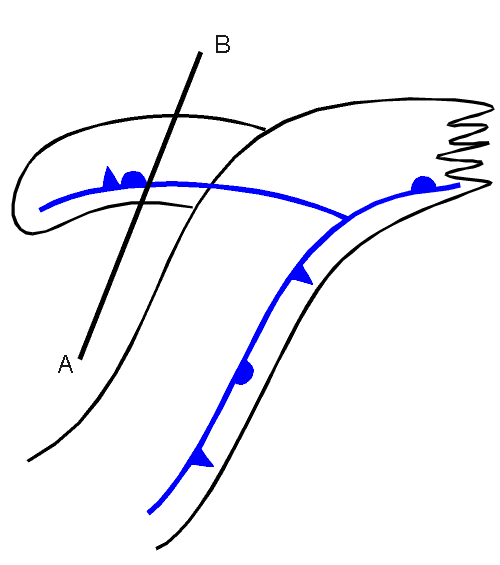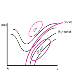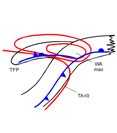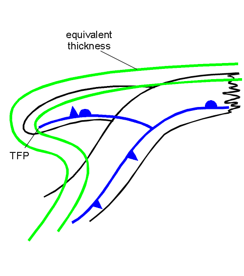 - A Warm Front inclined crowding zone in front of and a Cold Front inclined crowding zone behind, the isentropic trough feature. In this case the forward inclination of the isentropic trough is not as strongly pronounced as in the other case. Sometimes also a straight vertical trough axis can be observed.