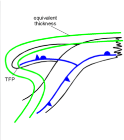 A prominent feature is the ridge of the equivalent thickness which is the consequence of the lifted warm air. In the case of well developed deep lows even a spiral structure of the ridge can be observed. But there are also situations which deviate from the distinct ridge structure. Well developed forms of Warm Front Occlusions and Cold Front Occlusions may lead to a more pronounced thickness gradient in the area of the Occlusion. This can be observed much better in the vertical cross section (see Typical appearance in vertical cross section). - Thermal front parameter (TFP):