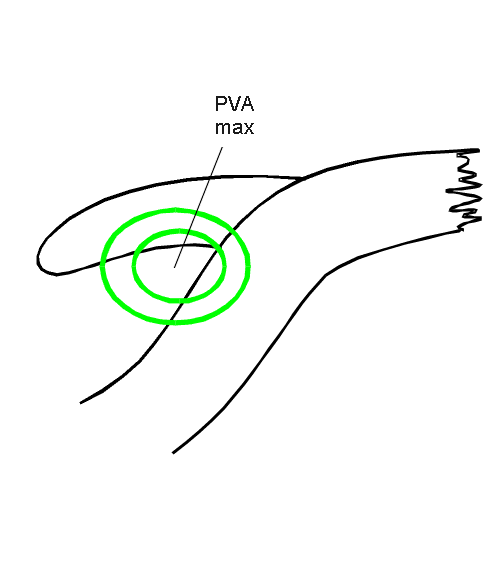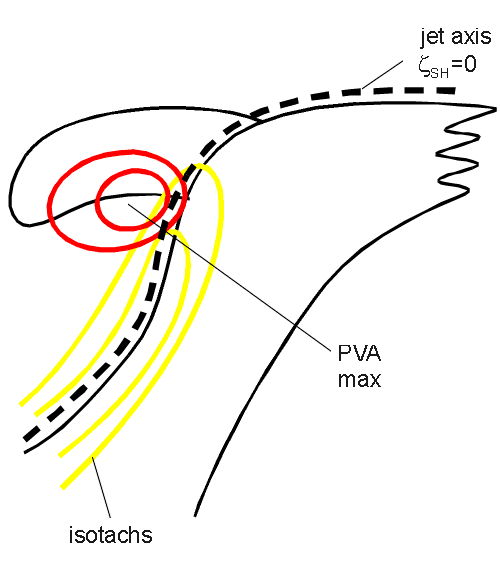 The cloud spiral of the occlusion is in general superimposed by PVA in the mid-levels and upper levels of the troposphere. As upper level troughs are involved, PVA is caused by both curvature and shear. But as described above the zero line of shear vorticity crosses the cloud spiral. The PVA maximum is very often situated within the left exit region of a jet streak (see Meteorological physical background and Weather events). There is a difference from the Warm Conveyor Belt Type of Occlusion, where curvature vorticity plays the dominant role (see Occlusion: Warm Conveyor Belt Type ).