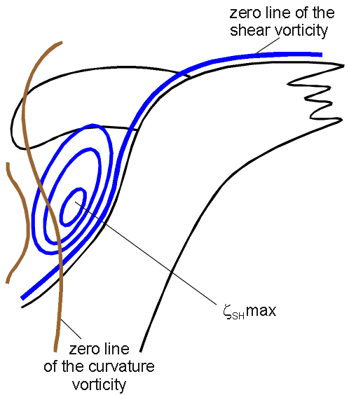 The whole cloudiness of the Occlusion is under the influence of warm advection. The warm advection maximum can be found in the centre of the cloud spiral, mostly close to the point of the Occlusion. The zero line of the temperature advection follows the rearward edge of the Occlusion cloud spiral - Zero line of the shear vorticity at 300 hPa: