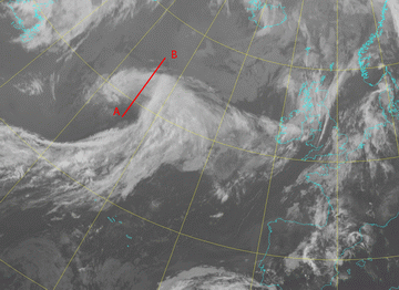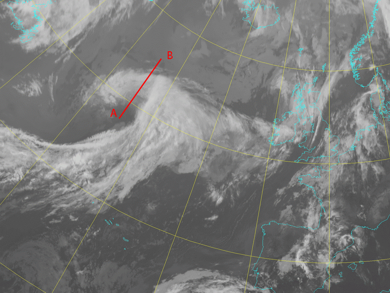 In cross section A, extending over the Atlantic from approximately 48N/34W to approximately 57N/34W, only the cold conveyor belt on the isentropic surface crosses the cross section perpendicularly. Humidity maxima and IR peaks contribute to the cold conveyor belt.
