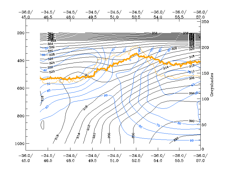 21 June 2005/00.00 UTC - Vertical cross section; black: isentropes (ThetaE), blue: relative humidity, orange