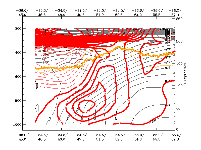 21 June 2005/00.00 UTC - Vertical cross section; black: isentropes (ThetaE), red thick: temperature advection - WA, red thin: temperature advection - CA, orange thin: IR pixel values, orange thick: WV pixel values