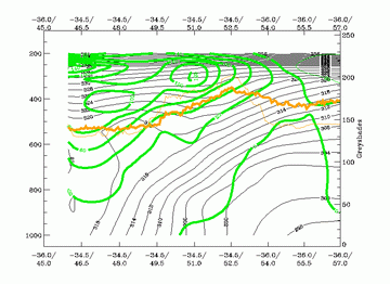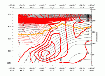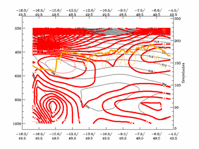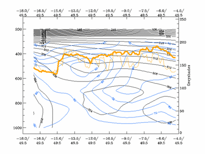 The cross section is taken through the partly dissolved Cold Front near the surface low. The Cold Front is seen on the left, approximately in the area between longitudes 18W and 12W. The cross sections show: