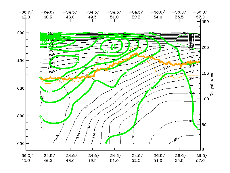 21 June 2005/00.00 UTC - Vertical cross section; black: isentropes (ThetaE), green thick: vorticity advection - PVA, green thin: vorticity advection - NVA, orange thin: IR pixel values, orange thick: WV pixel values