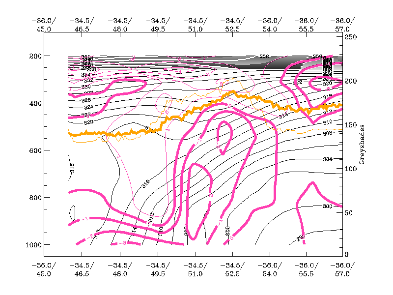 21 June 2005/00.00 UTC - Vertical cross section; black: isentropes (ThetaE), magenta thin: divergence, magenta thick: convergence, orange thin: IR pixel values, orange thick: WV pixel values