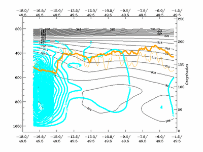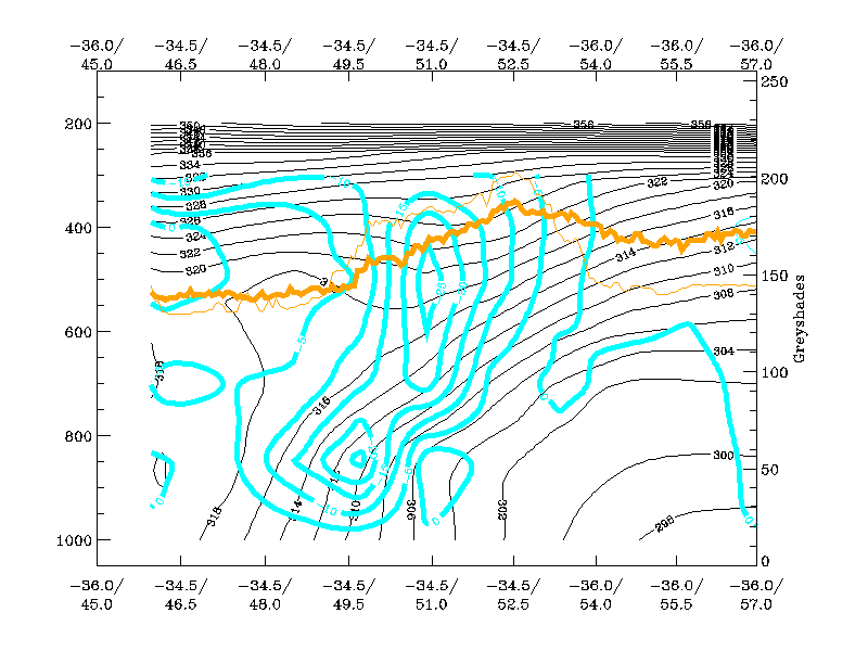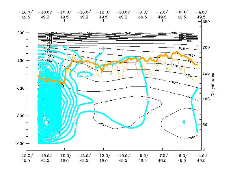 21 June 2005/00.00 UTC - Vertical cross section; black: isentropes (ThetaE), cyan thick: vertical motion (omega) - upward motion, cyan thin: vertical motion (omega) - downward motion, orange thin: IR pixel values, orange thick: WV pixel values