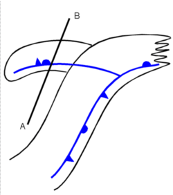 A T-bone is a frontal structure seen during a special development of a deepening low. It was first identified in 1990 by Shapiro and Keyser. The main feature of the cloudiness in a T-bone is that the Cold and Warm Fronts are separated from each other; the Cold Front near the low centre weakens, whereas the Warm Front and the Cold Front farther away strengthen. T-bones develop usually over the sea in wintertime in a strong zonal flow with a flat and confluent upper level trough. The name "T-bone" comes from the frontal fracture stage, where the Cold Front and the Warm Front are separated and perpendicular to each other.