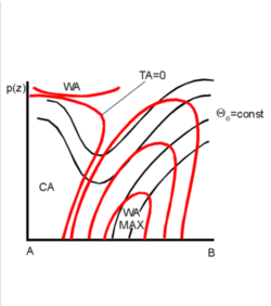 The whole area of the Warm Front inclined crowding zone and the leading part of the isentropic trough feature is under the influence of pronounced WA. The maximum of WA mostly can be found within the lower levels of the troposphere very close to the area where the Warm Front inclined crowding zone reaches the surface. A secondary pronounced area of WA can be found within the upper levels of the troposphere on the rear side of the isentropic trough. This area is typically situated at approximately 300 hPa and indicates the tropopause. The lower and mid-levels of the troposphere are characterized by pronounced CA. The zero line of temperature advection is close to the minimum of the isentropic trough in the lower and mid-levels of the troposphere. Very often the zero line in these levels is characterized by a forward inclination which leads to the development of a potentially unstable stratification of the troposphere (see Meteorological physical background and Key parameter).